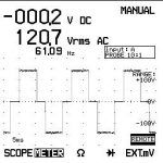 With the unit unloaded I proceeded to do a preliminary look at it with the 87 V, a digital meter. The 87, read that it was 120.2VAC and 61.12Hz.